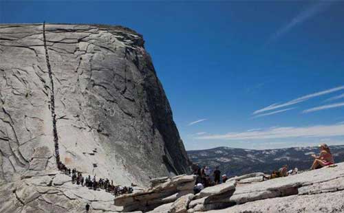 瑞士盧達(dá)本納的籬笆隧道,隧道位于2438米的空中,人必須匍匐前進(jìn)才能通過隧道,目光只能直視山腳,加劇恐懼感,隧道旁還有一條玻璃棧道。在伊瓜蘇大瀑布巴西一側(cè)的觀景臺(tái)上,拍攝一張?zhí)匠錾眢w的俯視照片。在美國(guó)約塞米蒂半圓穹山峰頂上,攀爬121米長(zhǎng)、幾乎90度垂直于地面的繩梯,這塊巨石也是全球攀巖愛好者的圣地。