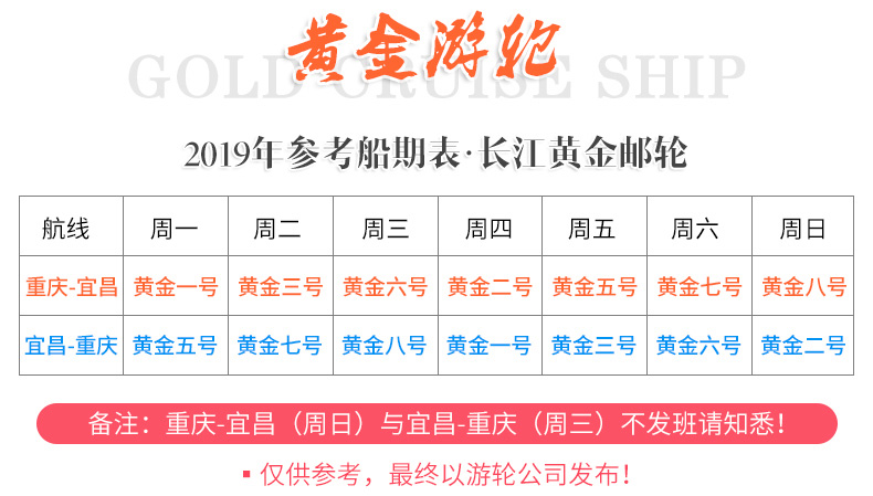 3、如遇長江枯水期和洪水期,為游客安全起見,大噸位游輪均可能依據(jù)政府禁令更換碼頭登船,即中轉(zhuǎn),請知悉。