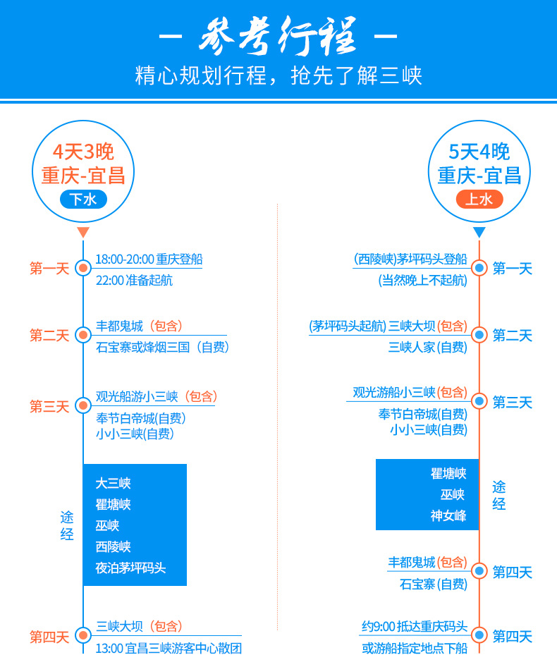 3、不含自費(fèi)游覽項(xiàng)目、景區(qū)小交通,如:豐都鬼城索道單程20元/人、往返35 元/人;三峽大壩景區(qū)電瓶車20元/人;三峽大壩規(guī)定,大件行李將強(qiáng)制托運(yùn),行李托運(yùn)費(fèi)30元/件(可隨身攜帶的行李標(biāo)準(zhǔn):體積不超過24×40×50厘米,且重量不超過5公斤);